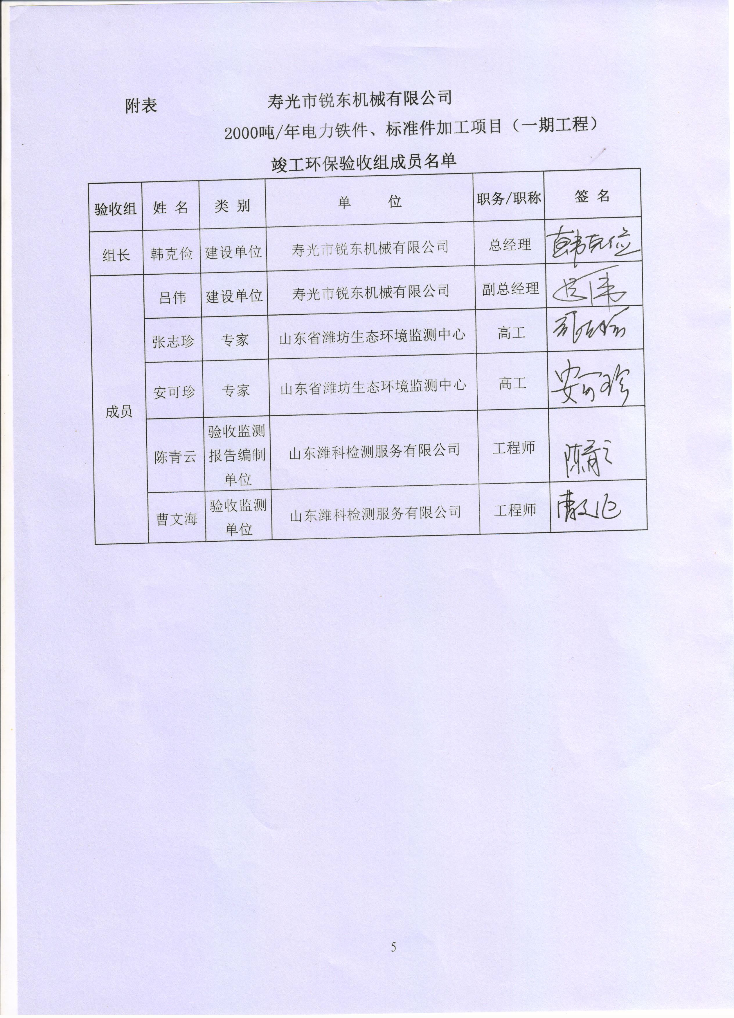 寿光市锐东机械有限公司 2000吨/年电力铁件、标准件加工项目(一期工程)验收报告表